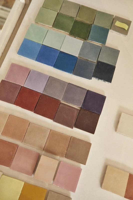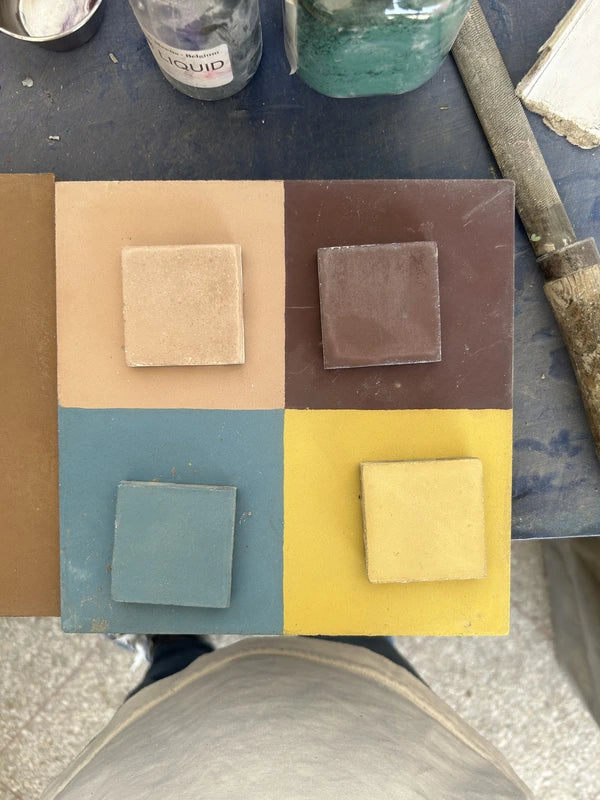 La creazione di una piastrella in cemento decorata è un'alchimia di materiali e pazienza. Tutto inizia con lo stampo, che determina la forma della piastrella. All'interno di questa struttura metallica, l'artigiano posiziona il "divisore": una sorta di griglia in ottone o bronzo dal design elaborato che traccia meticolosamente il contorno di ogni parte del futuro disegno. Poi arriva la fase cruciale della colorazione. I nostri artigiani preparano i propri coloranti, una miscela vibrante di polvere di marmo bianco, cemento e pigmenti naturali di alta qualità. Questa preparazione è essenziale per garantire l'intensità e la durata dei colori per cui siamo rinomati. La piastrella in cemento viene quindi realizzata strato per strato. Il primo, lo strato di usura, porta gli elementi decorativi. Segue un primo strato di cemento asciutto, progettato per assorbire l'umidità, e poi un secondo strato di malta cementizia grigia. Questa struttura a tre strati garantisce la rigidità e l'incredibile longevità della piastrella. È proprio questo che ci permette di produrre due spessori distinti: 16 mm per un'eccezionale durata a pavimento e 10 mm per una facile installazione a parete. Lo stampo riempito viene quindi posto sotto una pressa idraulica, che unisce gli strati senza fonderli completamente. Una volta estratta dallo stampo, la piastrella viene ripetutamente immersa in acqua per garantire una perfetta adesione, quindi lasciata pazientemente asciugare all'aria su appositi telai per diversi giorni.