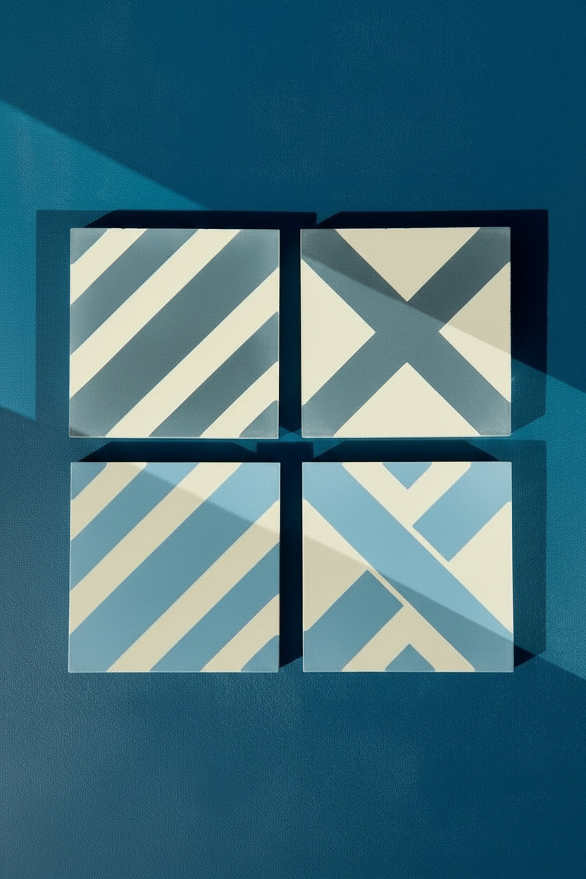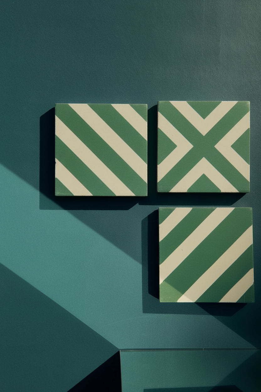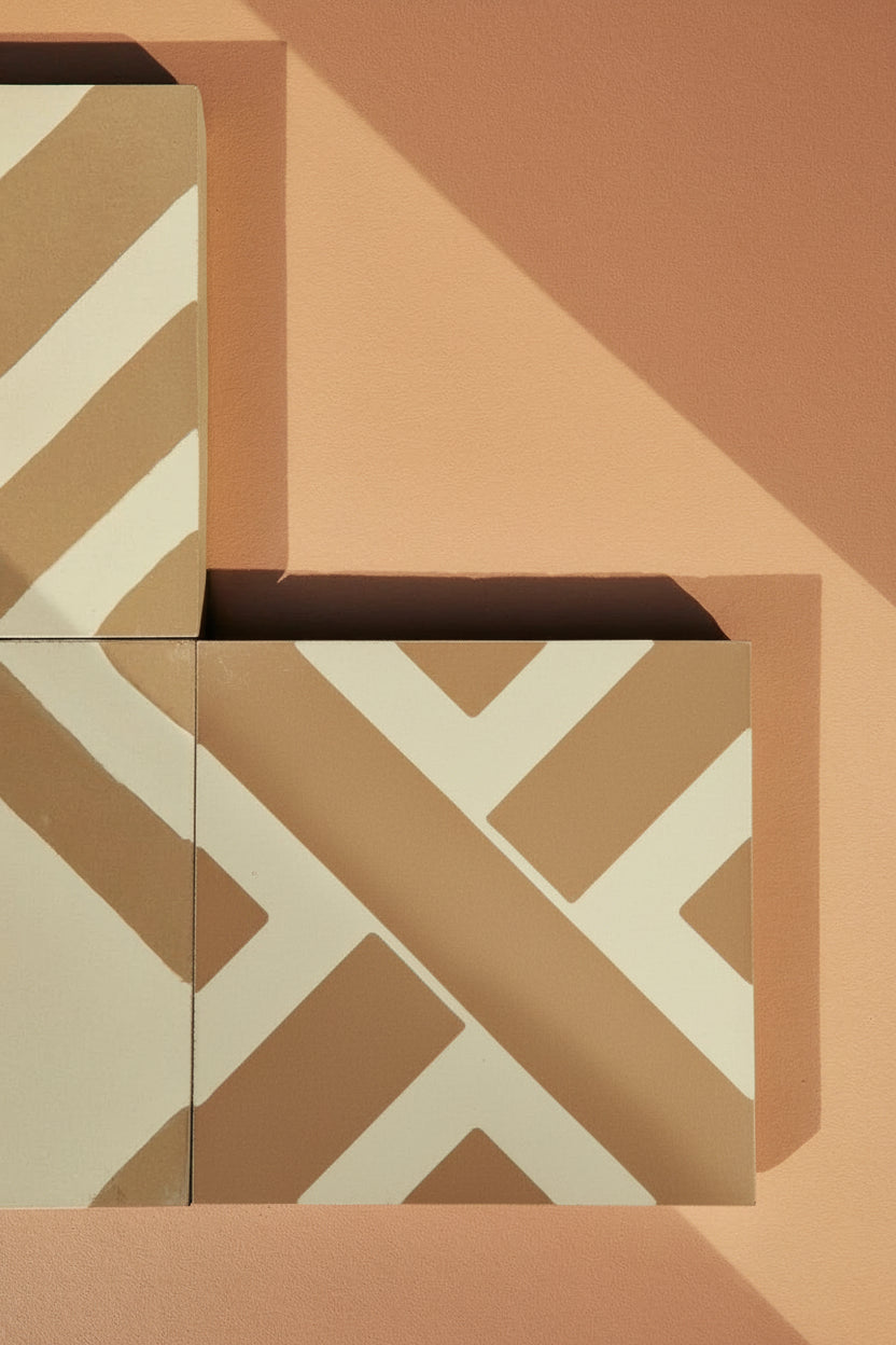 Pour Carocim, Baptiste Vandaele a relevé un défi passionnant : utiliser la contrainte du format carré (20x20 cm) pour créer l'infini. Loin des frises classiques ou des rosaces centrales, ses créations pour Carocim sont pensées comme des jeux de construction. Le carreau de ciment devient un module, un pixel géant. En jouant sur la rotation, l'inversion et l'assemblage, un même carreau peut générer des dizaines de dessins différents au sol.